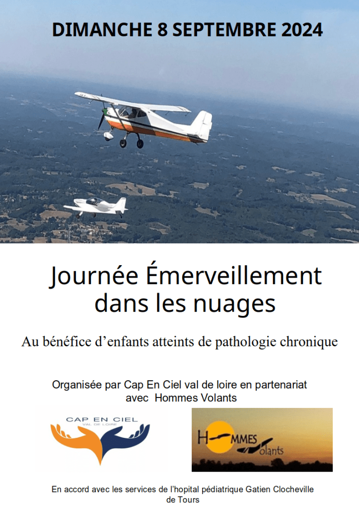 Le 8 Septembre 2024, si la météo assure ce que nous attendons d’elle, nous organisons sur la base de Hommes Volants, à Hommes (37), une journée d’accueil d’enfants malades pour leur faire découvrir les joies du vol aérien.